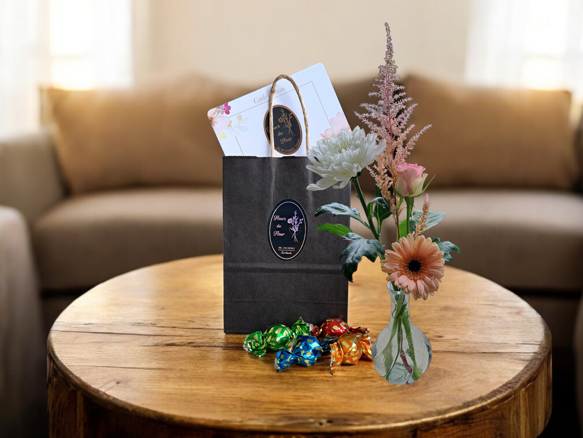kleed je cadeaubon leuk aan met in het tasje uiteraard de cadeaubon (waarde zelf te bepalen) 6 heerlijke chocobollen en een boeket Mini